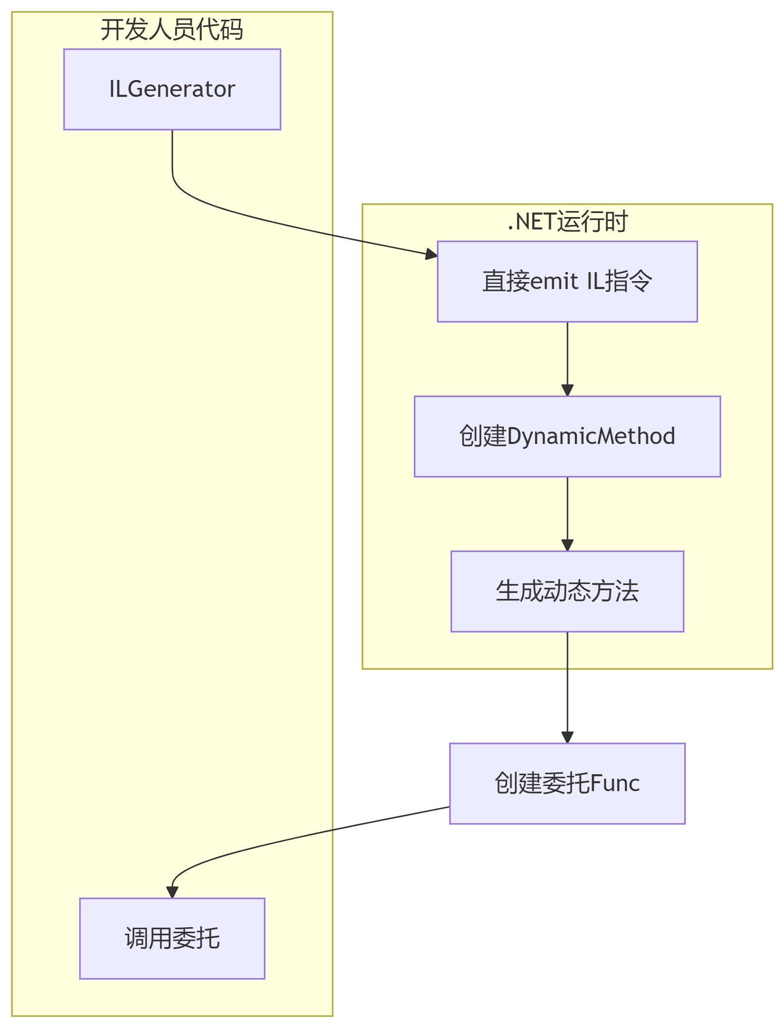 动态构建Linq的Lambda表达式,然后编译以后得到一个委托。首次运行成本高,需要编译表达式。后续调用,编译后的委托避免了,反射的运行时开销,性能接近直接调用。生成的猥琐类似下面: